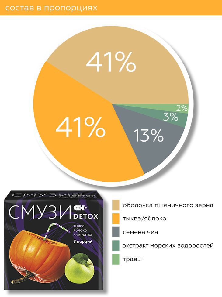 Уникальная формула детокс эффекта это три вида клетчатки, усиленные Сибирскими травами, тыквой и яблоком. Первый, натуральный смузи в виде сухой основы для приготовления детокс коктейля. Семена Чиа обогащают смузи Омега-3, ягода - витаминами, а клетчатка - главный очищающий компонент. Полностью натуральный, без добавления ароматизаторов, сахаров и консервантов. Смузи расфасован в 7 порционных пакетов. Способ употребления: 1-2 раза в день до еды, или вместо нее. Содержимое пакета размещать с жидкостью 200-250 мл. Для раскрытия вкуса ягоды при разведении в воде настоять 5 мин. При разведении в кисломолочных напитках, растительном молоке 20 мин. По желанию добавить в смузи мёд, сахар. Противопоказания: непереносимость ингредиентов.