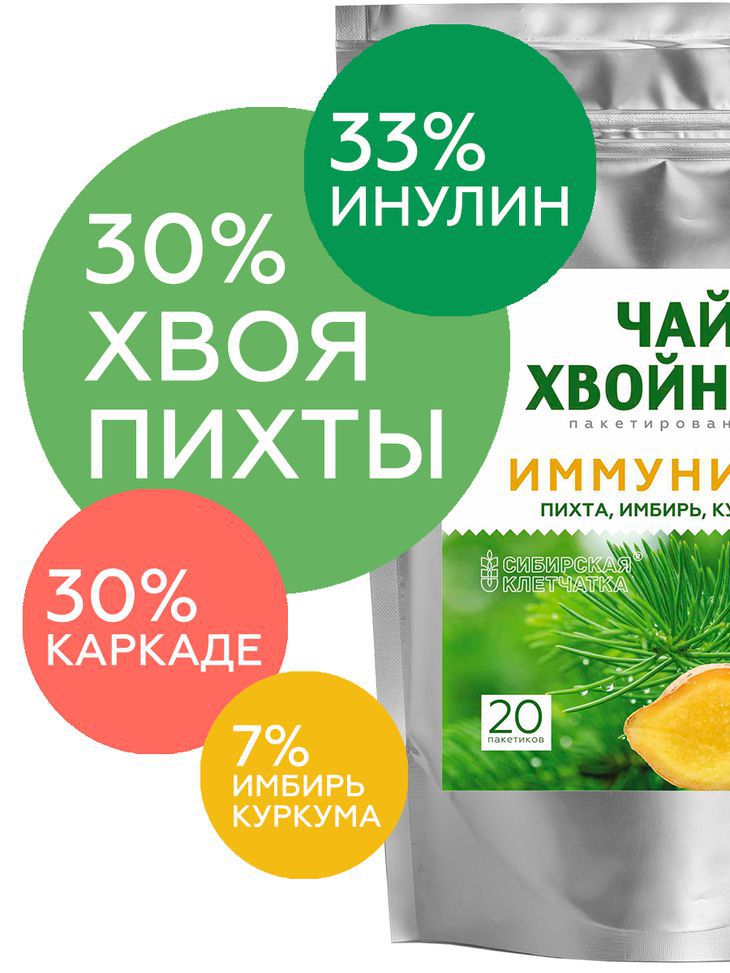 Трехсторонний подход к укреплению иммунитета. Общеукрепляющий эффект - гибискус, имбирь, куркума. Поддержка печени, детокс – хвоя пихты сибирской, инулин. Кишечный иммунитет, восстановление микрофлоры – пребиотик инулин.