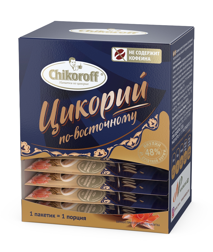 Цикорий по-восточному - горячий напиток для здорового питания, изготовленный из 100% корней цикория, выращенных и обработанных по уникальной технологии производства компании LEROUX, основанной в 1858 году (Франция). Идеальное решение для гурманов, предпочитающих свежесваренный ароматный цикорий, но не имеющих времени на приготовление в турке. Благодаря особой рецептуре CHIKOROFF® по-восточному откроет мир крепкого вкуса и густого чарующего аромата.