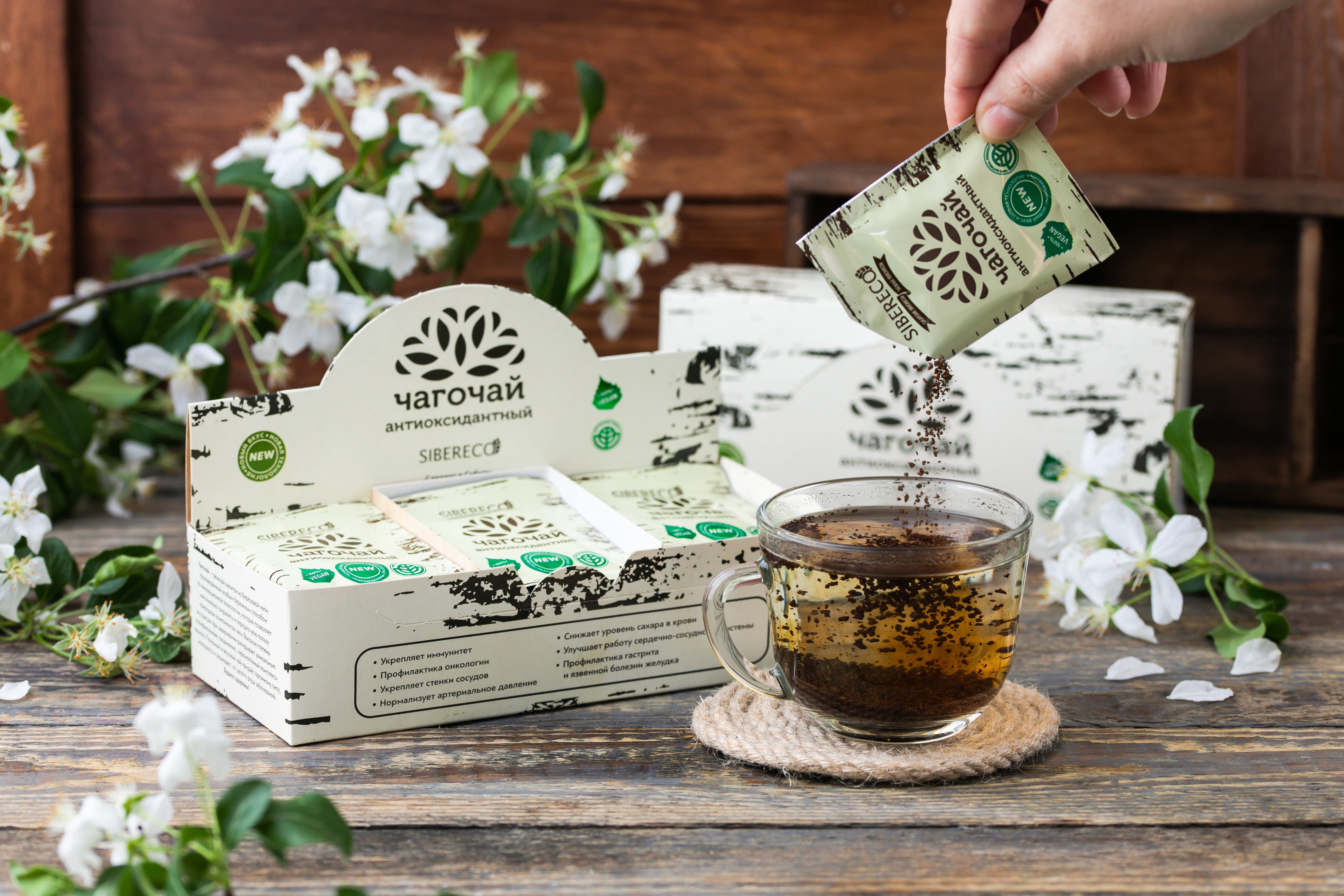 Представляем Чагочай в новой удобной упаковке - шоубокс, в котором 24 порционных пакетика. Наш Чагочай имеет тёмно-шоколадный цвет, таёжный аромат, мягкий, густой и бархатный вкус.