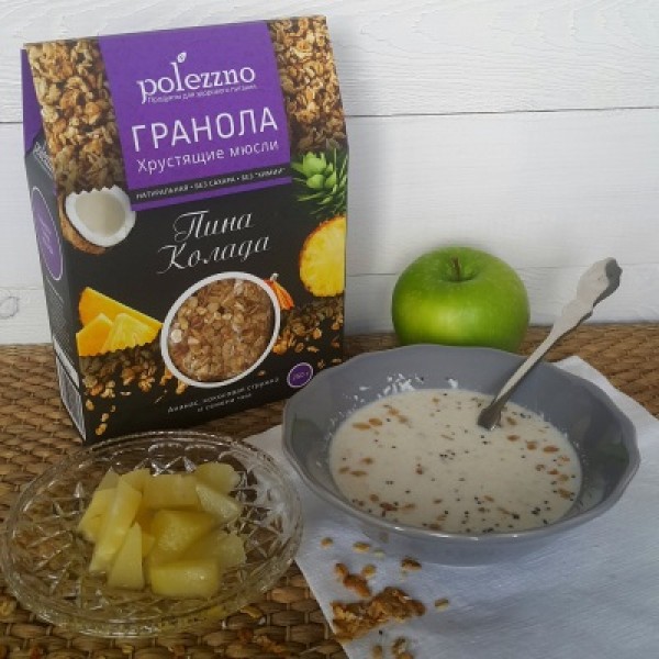 | Состав | Цельнозерновые овсяные хлопья, натуральный пчелиный мед, семена чиа, кокосовая стружка, сублимированный ананас, яблочный сок, морская соль |
