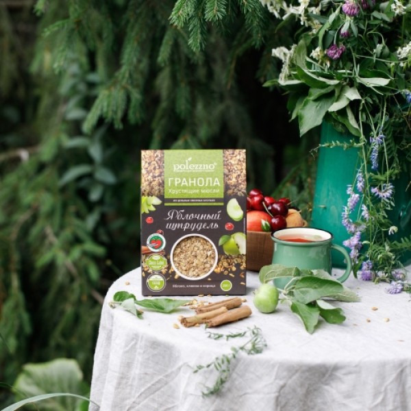 Гранола «Яблочный штрудель» наполнит ваше утро ароматом швейцарской кондитерской! Сублимированные кусочки яблок, корица и вяленая клюква – прекрасное сочетание.