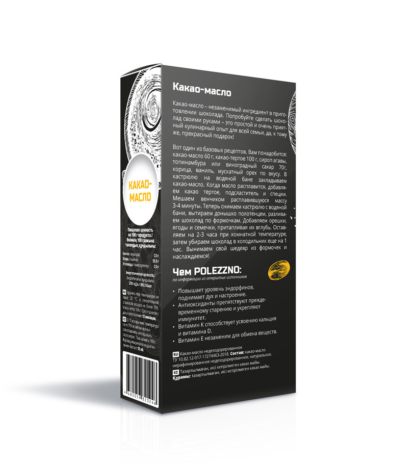 Какао-масло – незаменимый ингредиент в приготовлении шоколада. Попробуйте сделать шоколад своими руками – это простой и очень приятный кулинарный опыт для всей семьи, да к тому же прекрасный подарок! Вот один из базовых рецептов. Вам понадобится: какао-масло 60 г, какао-тертое 100 г, сироп агавы, топинамбура или виноградный сахар 70 г, корица, ваниль, мускатный орех по вкусу. В кастрюлю на водяной бане закладываем какао-масло. Когда масло расплавится, добавляем какао-тертое, подсластитель и специи. Мешаем венчиком расплавившуюся массу 3-4 минуты. Теперь снимаем кастрюлю с водяной бани, вытираем донышко полотенцем, разливаем шоколад по формочкам. Добавляем орешки, ягоды и семечки, притапливая их вглубь. Оставляем на 2-3 часа при комнатной температуре, затем убираем шоколад в холодильник еще на 1 час. Вынимаем свой шедевр из формочек и наслаждаемся! Чем polezzno: