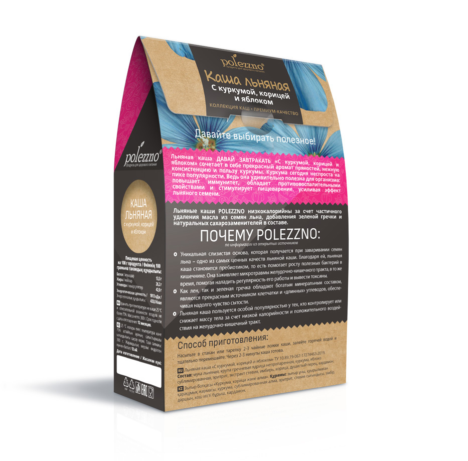 Льняная каша ДАВАЙ ЗАВТРАКАТЬ «С куркумой, корицей и яблоком» сочетает в себе прекрасный аромат пряностей, нежную консистенцию и пользу куркумы. Куркума сегодня неспроста сегодня на пике популярности. Ведь она удивительно полезна для организма: повышает иммунитет, обладает противовоспалительными свойствами и стимулирует пищеварение, усиливая эффект льняного семени.