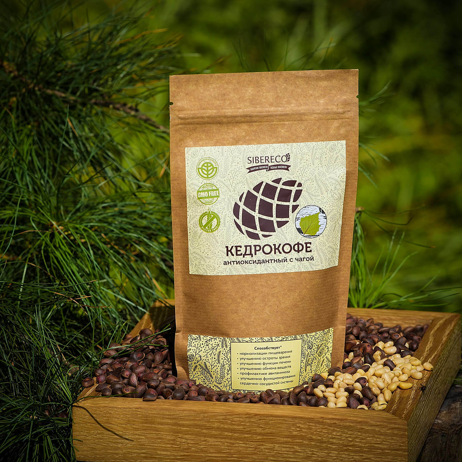 Состав: кедровый орех дроблёный, заменитель сливок (кукурузная патока, кокосовое масло, молочный белок), экстракт чаги гранулированный (содержит нерастворимый осадок).