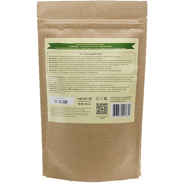 Кедрокофе сочетает в себе вкус натурального кедрового ореха, нежных сливок и сбалансированную сладость. Вкус «Кедрокофе» станет отличной альтернативой зарубежным какао, «несквикам», кофе «3в1». Для производства «Кедрокофе» мы используем только натуральные ингредиенты. При заваривании напиток дает натуральный (съедобный) осадок, поэтому рекомендуем использовать френч-пресс либо кофеварку, как для молотого кофе.