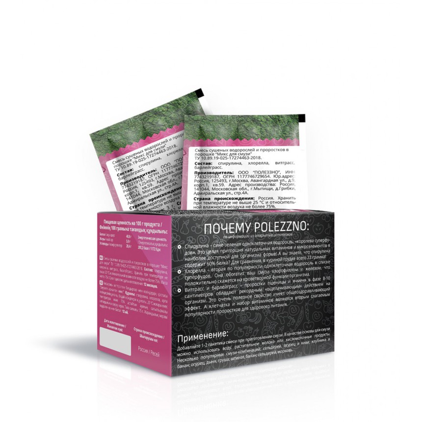 Густые и вкусные напитки из ягод и овощей, смузи, станут еще полезнее, если вы добавите в них 1–2 пакетика смеси для смузи POLEZZNO. Идеальная пропорция водорослей и проростков зарядит энергией и обогатит завтрак натуральными витаминами и минералами. Не зря компоненты смеси называют суперфудами!