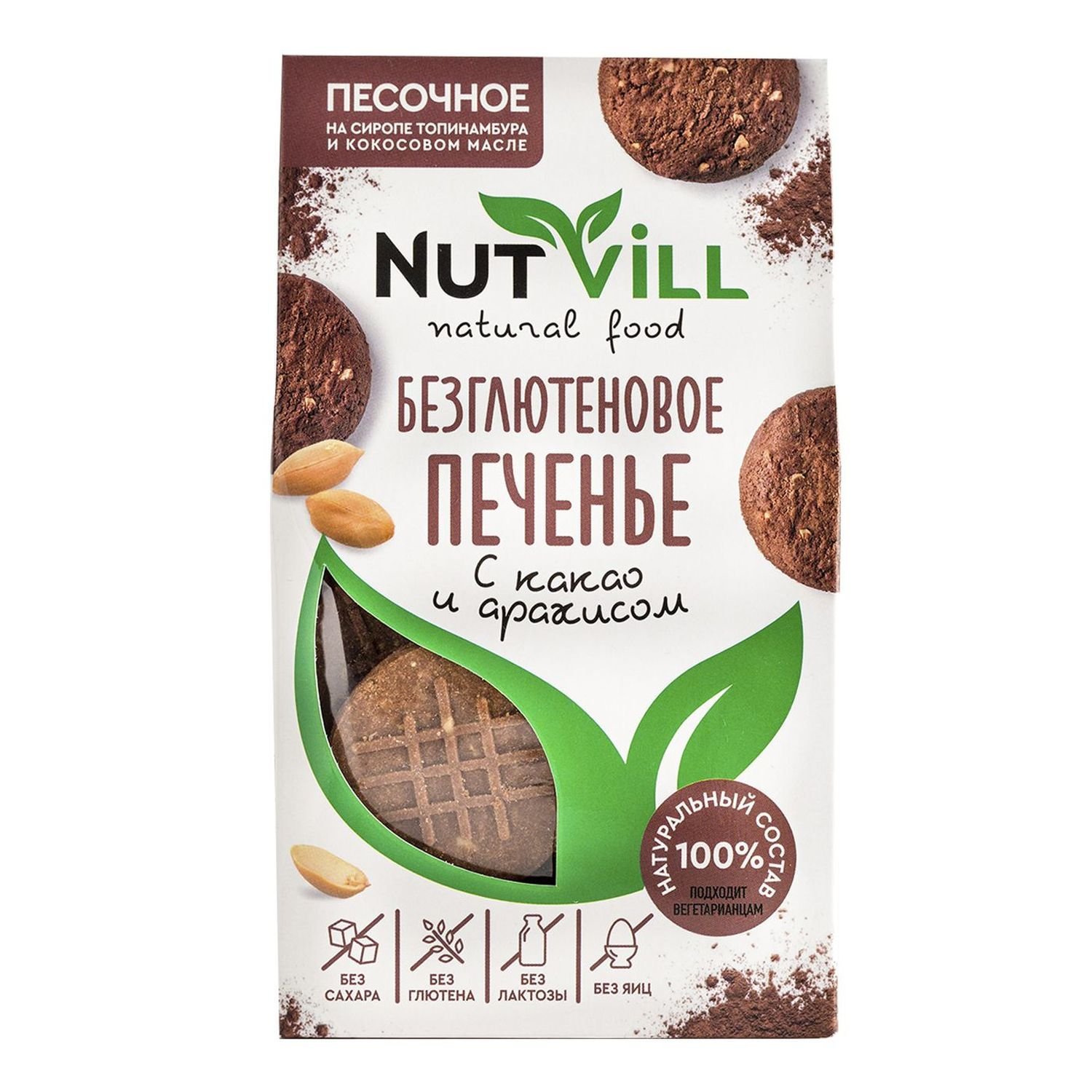 Печенье NutVill разработано по авторскому рецепту ведущими технологами при участии врачей-диетологов. Не содержит: глютена, сахара, молочных продуктов, яиц, красителей и консервантов. Печенье NutVill не только полезное, но и по-домашнему вкусное. Песочное печенье быстро насытит и зарядит организм на весь день. А какао и арахис добавляют печенью пикантности, благодарю чему создается вкус с ноткой горького шоколада. Здоровье, польза и красота в каждой пачке!