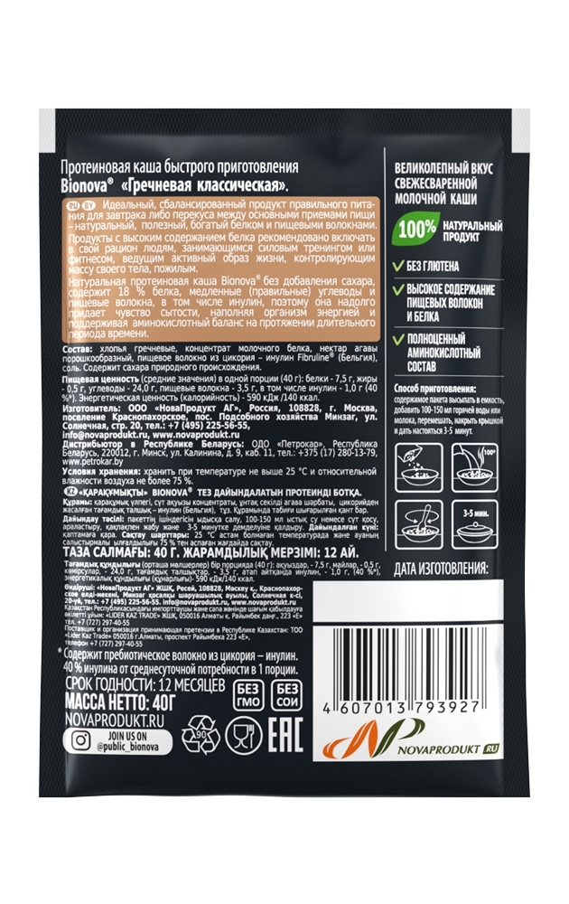 Натуральная протеиновая гречневая каша Bionova® без добавления сахара, содержит 18 % белка, медленные (правильные) углеводы и пищевые волокна, в том числе инулин, поэтому она надолго придает чувство сытости, наполняя организм энергией и поддерживая аминокислотный баланс на протяжении длительного периода времени.