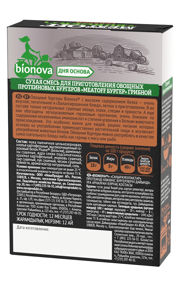 Овощной бургер Bionova® грибной — очень вкусное, питательное и сбалансированное блюдо, легкое в приготовлении. В их составе только натуральные сушеные овощи, злаки, специи и пряности. Содержит 18% легкоусвояемого горохового белка, который очень близок по содержанию незаменимых аминокислот и степени усвоения к белкам животного происхождения.
