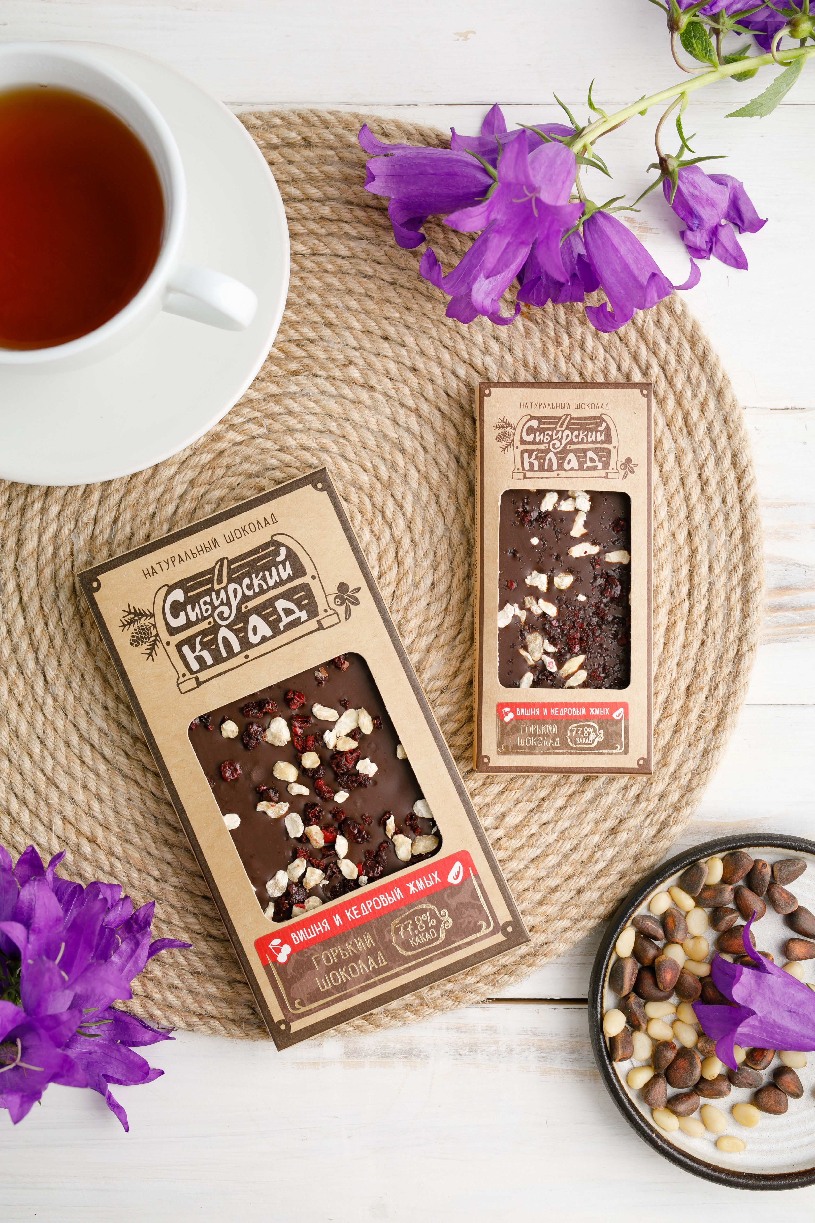 Горький шоколад "Сибирский Клад" приготовлен из какао-бобов "Фино де Арома", ароматной вишни, кедрового жмыха с лучших кедров Томской области и виноградного сахара.