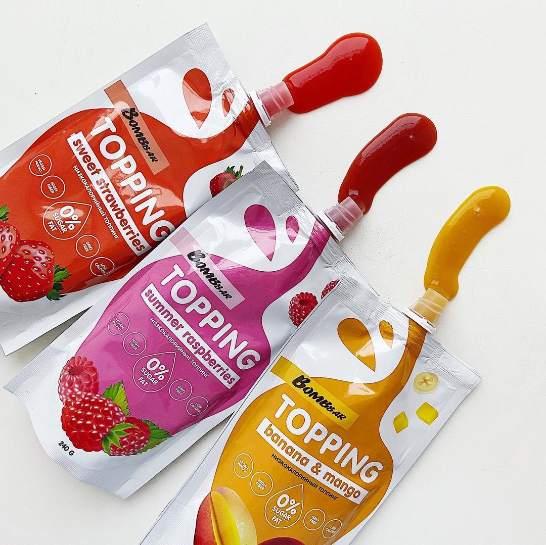 Удобно добавлять в каши, творог. Ещё они подойдут для украшения десертов, создания вкусной прослойки без сахара между бисквитами в тортах или блинчиками Bombbar. Топпинги Bombbar подходят для добавления в напитки - в кофе, молочные или протеиновые коктейли. В общем, выбирай топпинг, если тебе нужна более жидкая однородная консистенция для украшения или придания вкуса.