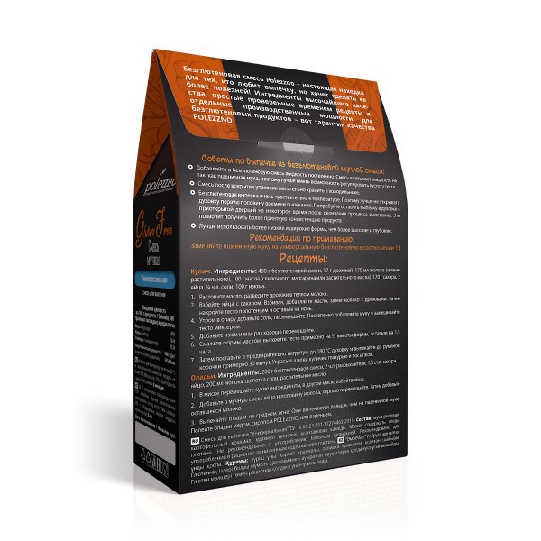 Универсальная безглютеновая смесь подходит для приготовления пирогов, печенья, хлеба, вафель и блинчиков. Строго следуйте рецепту для наилучшего результата. Желательно использовать рецепты безглютеновой выпечки.