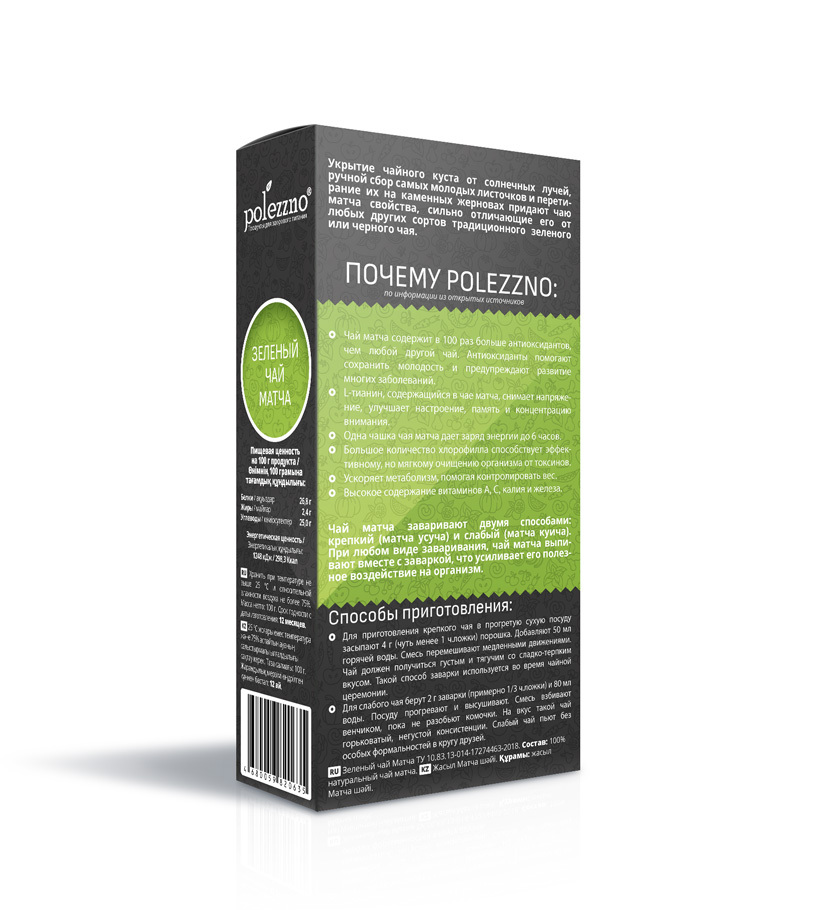 Чай маття POLEZZNO по сортности задекларирован как cooking matcha, то есть кулинарный матча, но по качеству он принадлежит к сорту Ceremony-grade, то есть к Церемониальному чаю матча. Разница между сортами - в более богатом букете и менее выраженной горчинке, свойственной любому сорту чая маття.