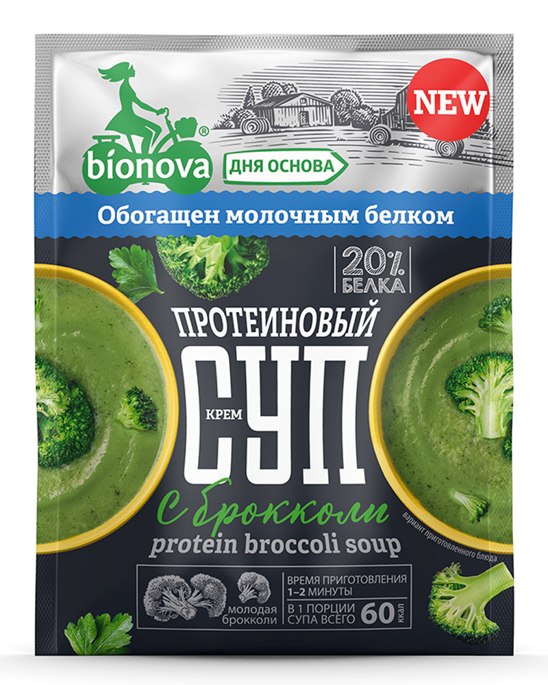 Натуральный протеиновый крем-cуп с брокколи Bionova с высоким содержанием белка, низким содержанием жира и натуральными ингредиентами специально разработаны для людей, ведущих активный образ жизни, идущих в ногу со временем, но, несмотря на высокий жизненный ритм, следящих за своим питанием.