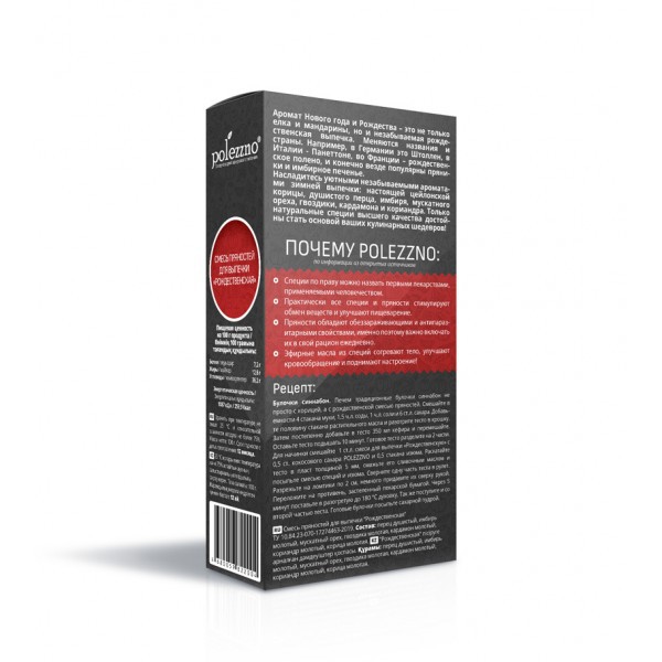 | Состав | Перец душистый, имбирь молотый, мускатный орех, гвоздика молотая, кардамон молотый, кориандр молотый, корица молотая |