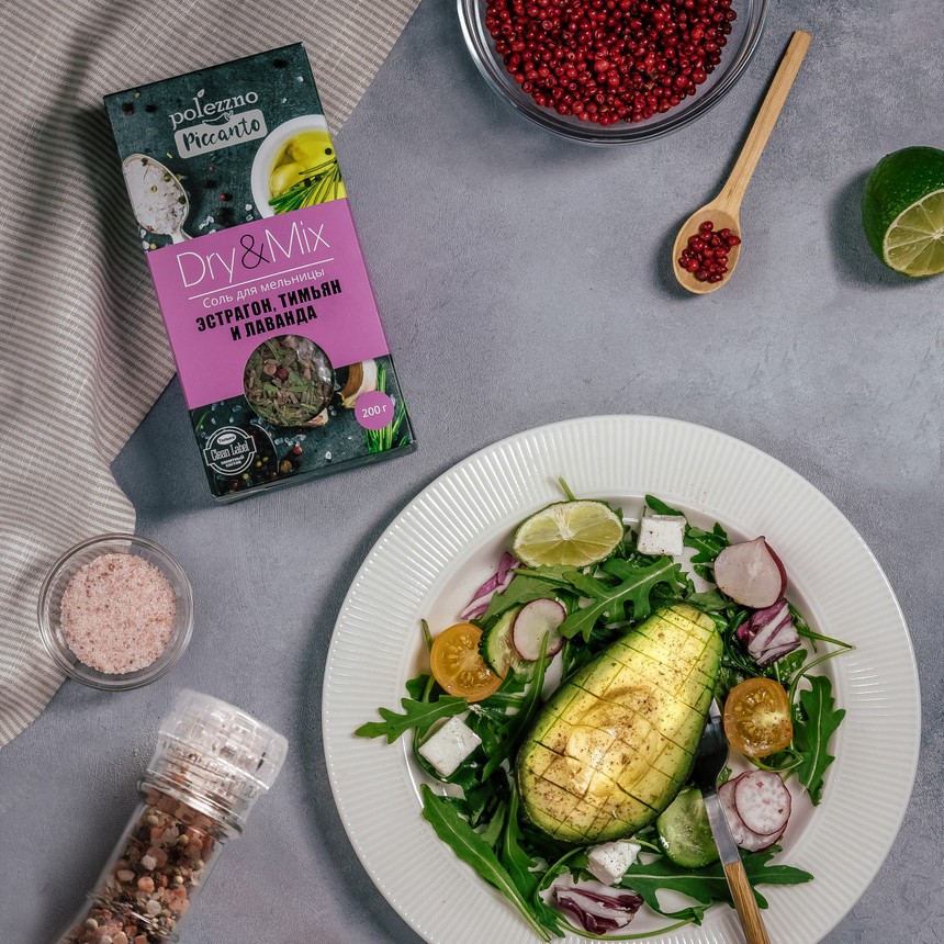 Соль розовая гималайская, перец черный, перец душистый, перец розовый, эстрагон, тимьян, лаванда.