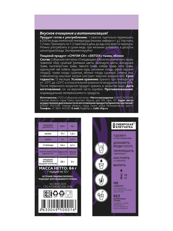 Уникальная формула детокс эффекта это три вида клетчатки, усиленные Сибирскими травами, тыквой и яблоком. Первый, натуральный смузи в виде сухой основы для приготовления детокс коктейля. Семена Чиа обогащают смузи Омега-3, ягода - витаминами, а клетчатка - главный очищающий компонент. Полностью натуральный, без добавления ароматизаторов, сахаров и консервантов. Смузи расфасован в 7 порционных пакетов. Способ употребления: 1-2 раза в день до еды, или вместо нее. Содержимое пакета размещать с жидкостью 200-250 мл. Для раскрытия вкуса ягоды при разведении в воде настоять 5 мин. При разведении в кисломолочных напитках, растительном молоке 20 мин. По желанию добавить в смузи мёд, сахар. Противопоказания: непереносимость ингредиентов.