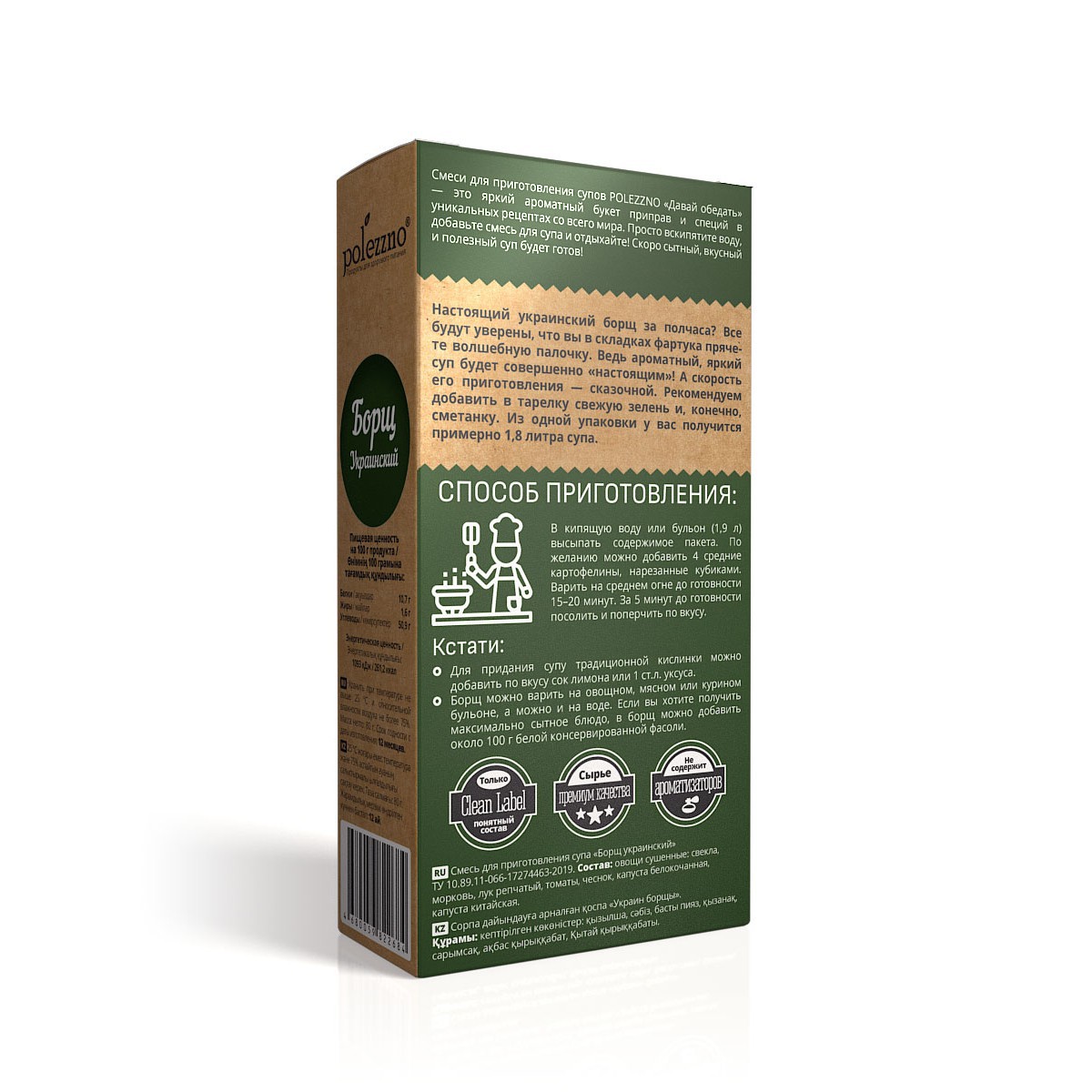 Настоящий украинский борщ за полчаса? Все будут уверены, что вы в складках фартука прячете волшебную палочку. Ведь ароматный, яркий суп будет совершенно «настоящим»! А скорость его приготовления – сказочной. Рекомендуем добавить в тарелку свежую зелень и, конечно, сметанку. Из одной упаковки у вас получится примерно 1,8 литра супа.