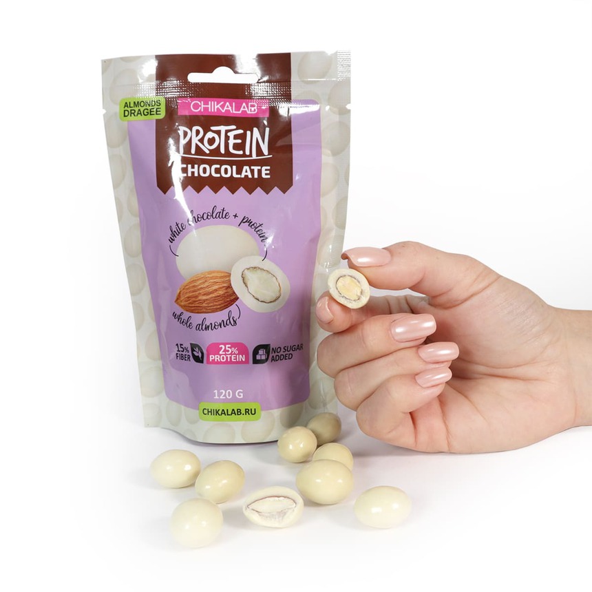 Состав: миндаль, шоколад белый (водорастворимые волокна кукурузы, какао масло, молоко сухое цельное, молоко сухое обезжиренное, эмульгатор (соевый лецитин), ароматизаторы натуральные, подсластитель (сукралоза)), концентрат сывороточного белка, глянцеватель.