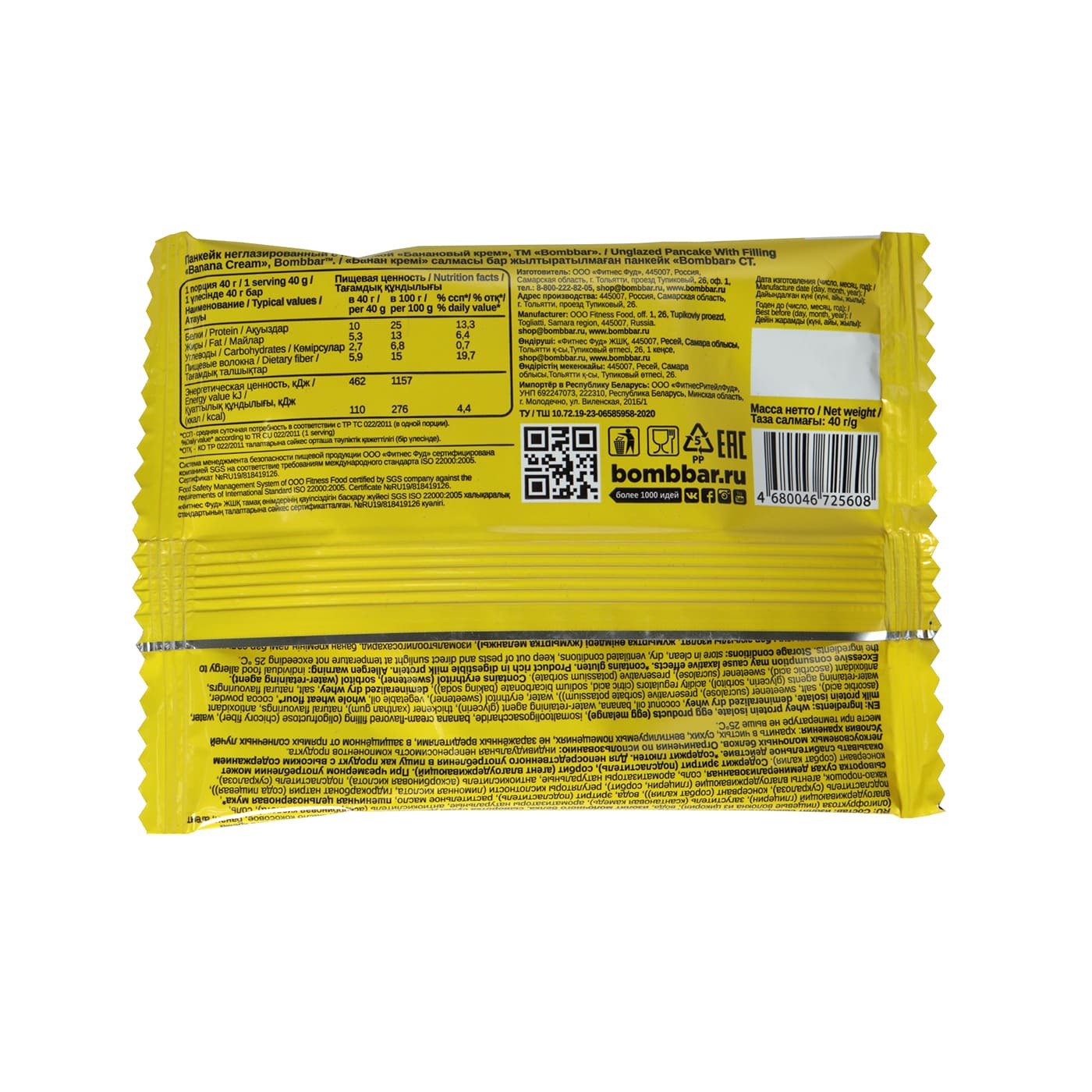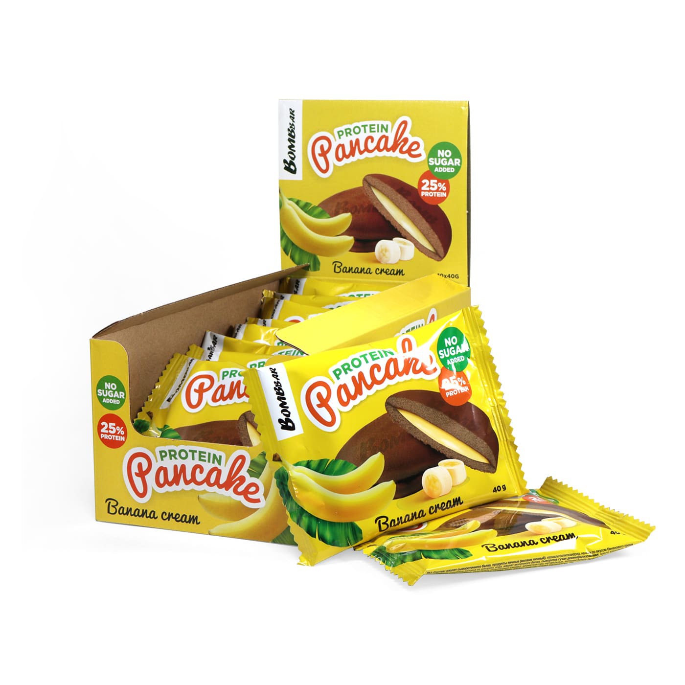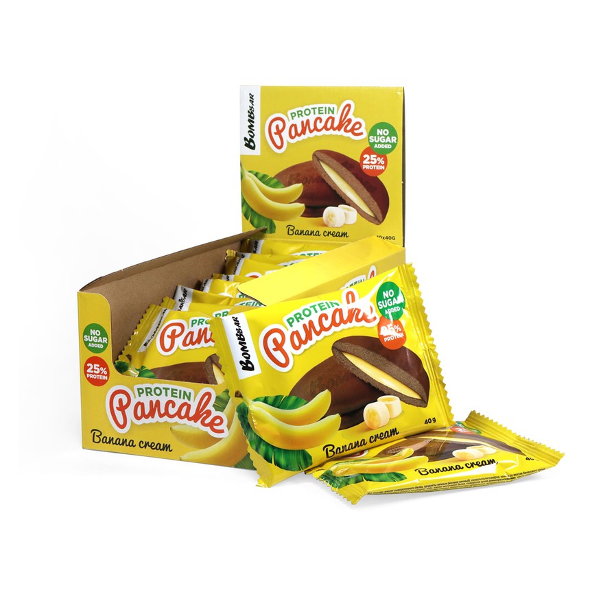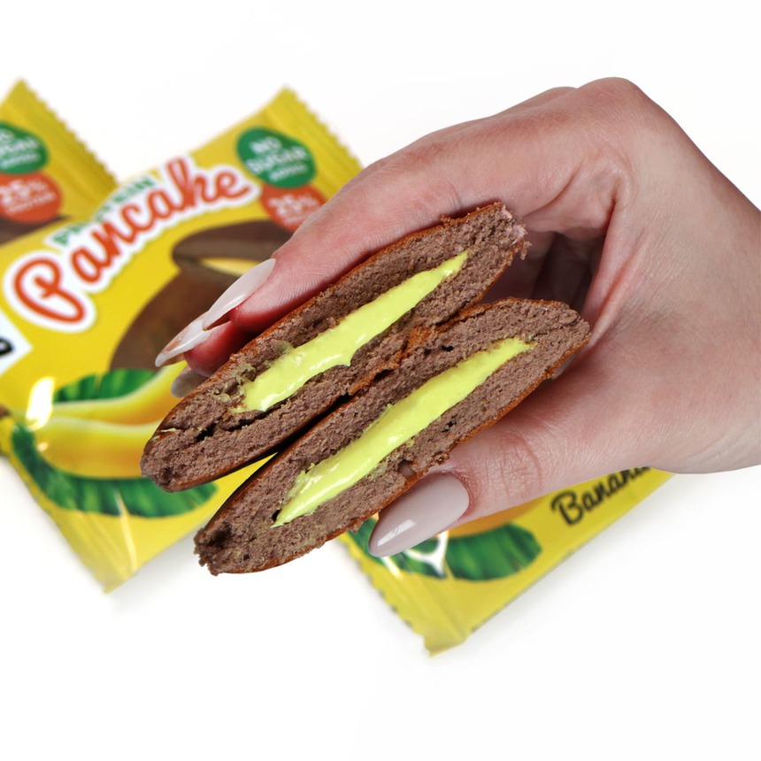 изолят сывороточного белка, продукты яичные (меланж яичный), изомальтоолигосахарид, начинка со вкусом бананового крема (олигофруктоза (пищевые волокна из цикория), вода, изолят молочного белка, сыворотка сухая деминерализованная, масло кокосовое, банан, агент влагоудерживающий (глицерин), загуститель (ксантановая камедь), ароматизаторы натуральные, антиокислитель (аскорбиновая кислота), соль, подсластитель (сукралоза), консервант (сорбат калия)), вода, эритрит (подсластитель), растительное масло, пшеничная цельнозерновая мука (содержит глютен), какао-порошок, агенты влагоудерживающие (глицерин, сорбит), регуляторы кислотности (лимонная кислота, гидрокарбонат натрия (сода пищевая)), сыворотка сухая деминерализованная, соль, ароматизаторы натуральные, антиокислитель (аскорбиновая кислота), подсластитель (сукралоза), консервант (сорбат калия).