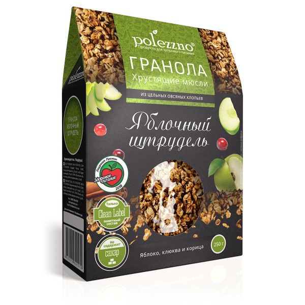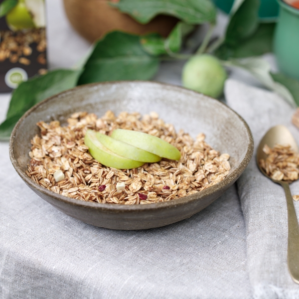 Гранола «Яблочный штрудель» наполнит ваше утро ароматом швейцарской кондитерской! Сублимированные кусочки яблок, корица и вяленая клюква – прекрасное сочетание.