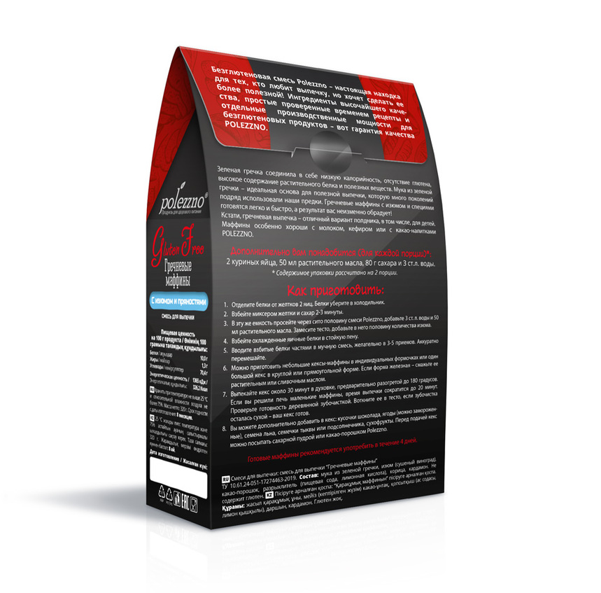 | Состав | Мука из зеленой гречки, изюм (сушеный виноград), кэроб, какао-порошок, разрыхлитель (пищевая сода, лимонная кислота), корица, кардамон. |