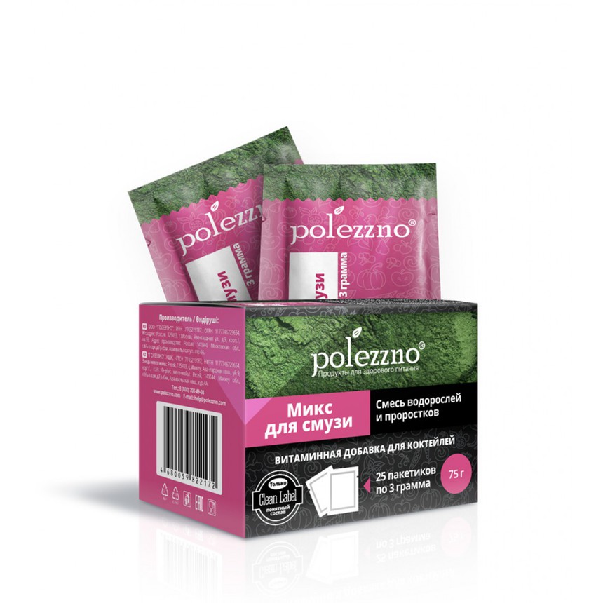 Густые и вкусные напитки из ягод и овощей, смузи, станут еще полезнее, если вы добавите в них 1–2 пакетика смеси для смузи POLEZZNO. Идеальная пропорция водорослей и проростков зарядит энергией и обогатит завтрак натуральными витаминами и минералами. Не зря компоненты смеси называют суперфудами!