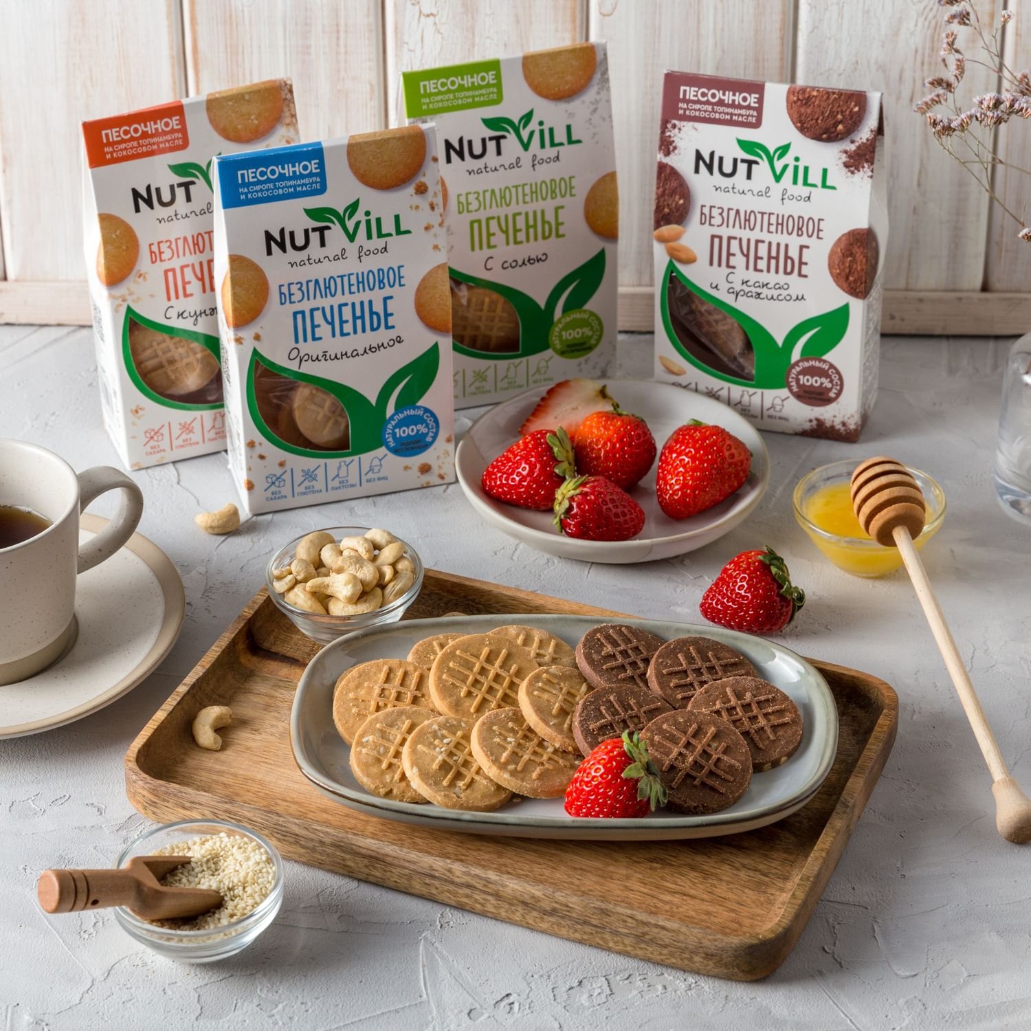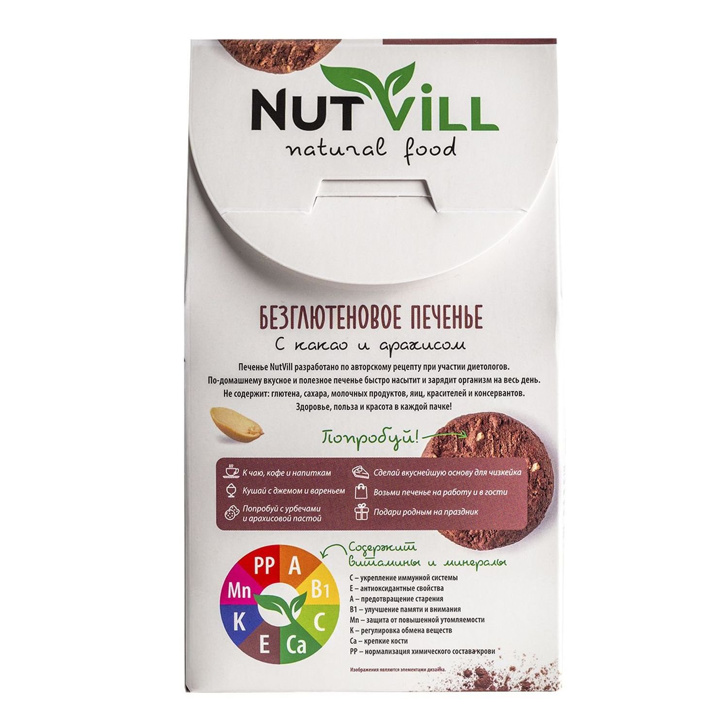 Печенье NutVill разработано по авторскому рецепту ведущими технологами при участии врачей-диетологов. Не содержит: глютена, сахара, молочных продуктов, яиц, красителей и консервантов. Печенье NutVill не только полезное, но и по-домашнему вкусное. Песочное печенье быстро насытит и зарядит организм на весь день. А какао и арахис добавляют печенью пикантности, благодарю чему создается вкус с ноткой горького шоколада. Здоровье, польза и красота в каждой пачке!