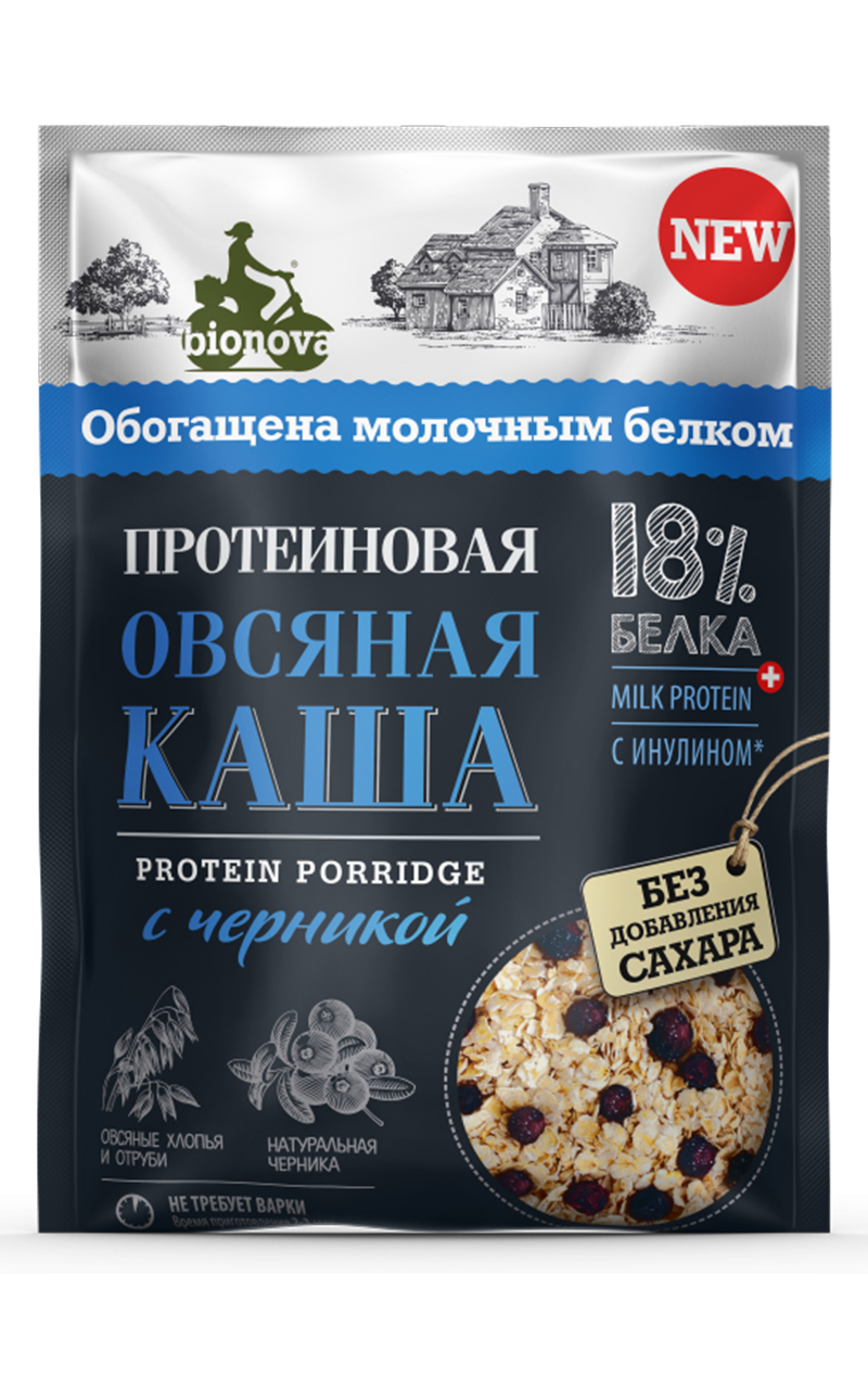 Натуральная протеиновая овсяная каша Bionova® с черникой без добавления сахара, содержит 18 % белка, медленные (правильные) углеводы и пищевые волокна, в том числе инулин, поэтому она надолго придает чувство сытости, наполняя организм энергией и поддерживая аминокислотный баланс на протяжении длительного периода времени.