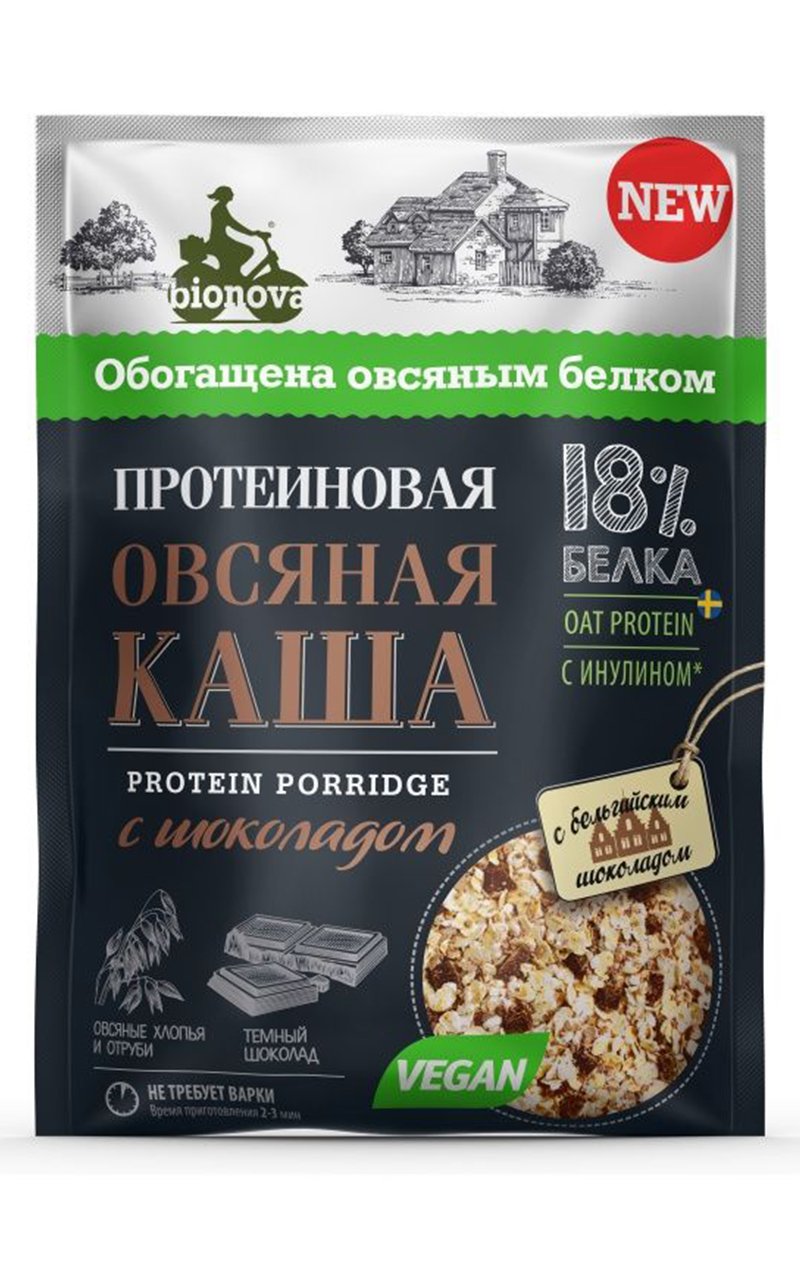 Натуральная протеиновая овсяная каша Bionova® с шоколадом без добавления сахара, содержит 18 % белка, медленные (правильные) углеводы и пищевые волокна, в том числе инулин, поэтому она надолго придает чувство сытости, наполняя организм энергией и поддерживая аминокислотный баланс на протяжении длительного периода времени.