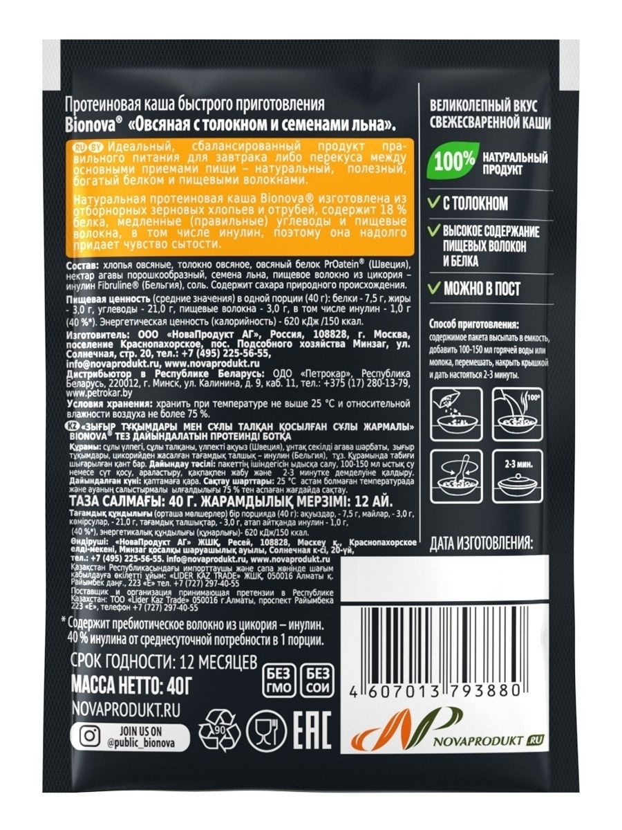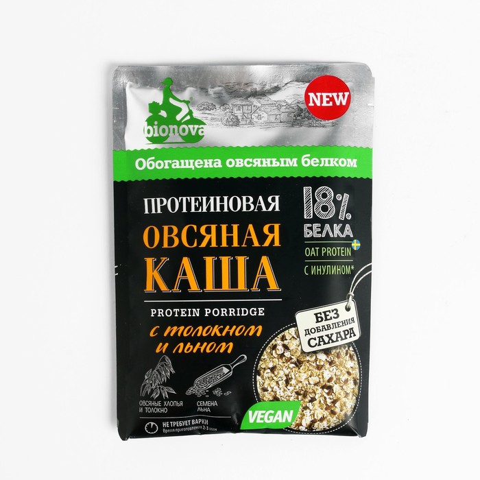 Натуральная протеиновая овсяная каша Bionova® с толокном и льном без добавления сахара, содержит 18 % белка, медленные (правильные) углеводы и пищевые волокна, в том числе инулин, поэтому она надолго придает чувство сытости, наполняя организм энергией и поддерживая аминокислотный баланс на протяжении длительного периода времени.