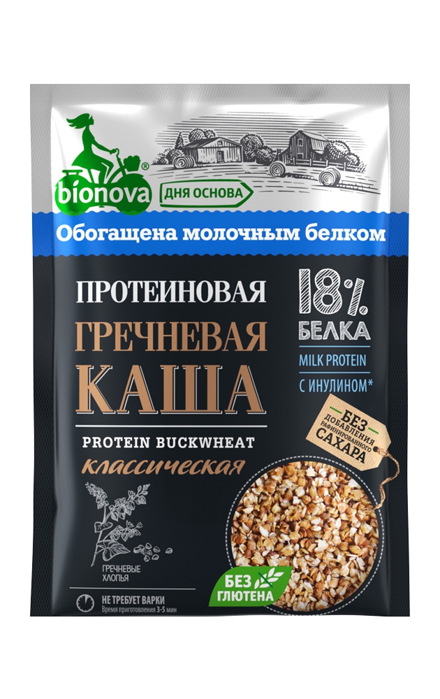 Натуральная протеиновая гречневая каша Bionova® без добавления сахара, содержит 18 % белка, медленные (правильные) углеводы и пищевые волокна, в том числе инулин, поэтому она надолго придает чувство сытости, наполняя организм энергией и поддерживая аминокислотный баланс на протяжении длительного периода времени.