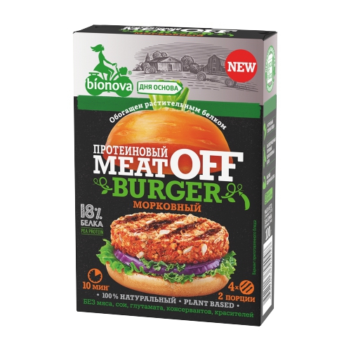 Овощной бургер Bionova® морковный — очень вкусное, питательное и сбалансированное блюдо, легкое в приготовлении. В их составе только натуральные сушеные овощи, злаки, специи и пряности. Содержит 18% легкоусвояемого горохового белка, который очень близок по содержанию незаменимых аминокислот и степени усвоения к белкам животного происхождения.