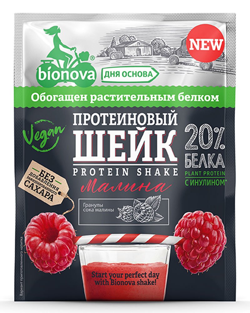 Натуральный протеиновый шейк Bionova® с малиной без добавления сахара, содержит 20 % белка, медленные (правильные) углеводы и пищевые волокна, в том числе инулин, поэтому он надолго придает чувство сытости, наполняя организм энергией и поддерживая аминокислотный баланс на протяжении длительного периода времени.