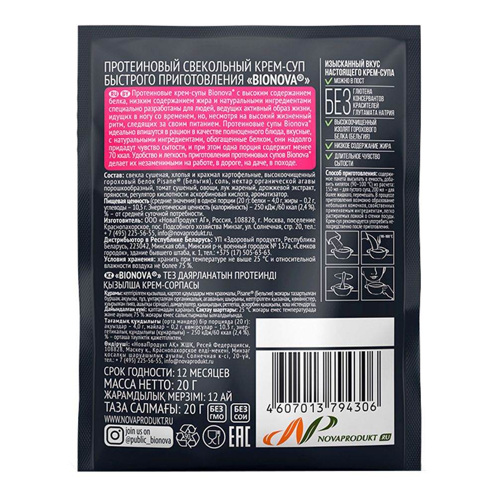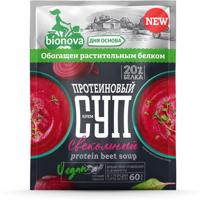 Натуральный протеиновый свекольный крем-cуп Bionova® с высоким содержанием вегетарианского белка, низким содержанием жира и натуральными ингредиентами специально разработаны для людей, ведущих активный образ жизни, идущих в ногу со временем, но, несмотря на высокий жизненный ритм, следящих за своим питанием.
