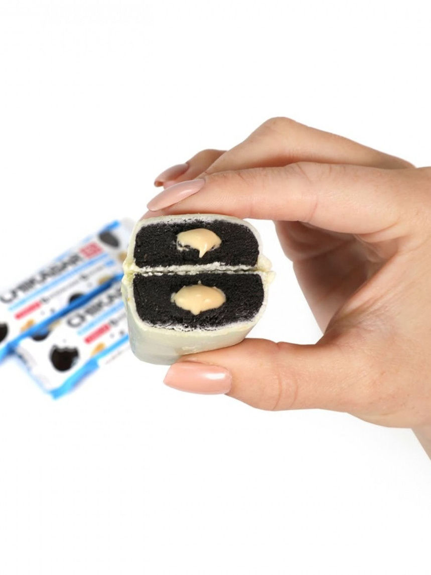 белковая смесь (концентрат сывороточного белка, концентрат молочного белка), белый шоколад (водорастворимые волокна кукурузы, масло какао, молоко сухое цельное, молоко сухое обезжиренное, эмульгатор (соевый лецитин), ароматизаторы натуральные, подсластитель (сукралоза)), паста белая молочная с кешью (кешью, водорастворимые волокна кукурузы, изолят сывороточного белка, кокосовое масло, молоко сухое обезжиренное, эмульгатор (соевый лецитин), ароматизаторы натуральные, антиокислитель (аскорбиновая кислота), подсластитель (сукралоза)), водорастворимые волокна кукурузы, инулин (пищевые волокна), олигофруктоза (пищевые волокна), масло кокосовое, вода, агенты влагоудерживающие (глицерин, сорбит), какао-порошок, рисовые шарики (рисовая мука, кукурузная крупа, соль), соль, ароматизаторы натуральные, регулятор кислотности (лимонная кислота), эмульгатор (соевый лецитин), краситель натуральный (чёрный (растительный кокосовый уголь)), антиокислитель (аскорбиновая кислота), консервант (сорбат калия), натуральный подсластитель (стевиозид).