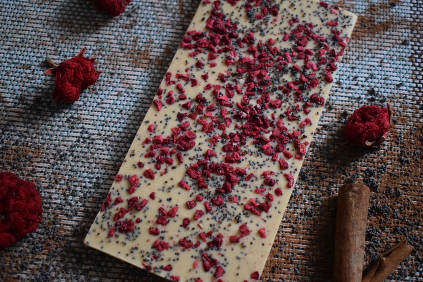 | Состав: | какао масло, сухое молоко, сахар тростниковый, семена мака, малина сублимированная. |