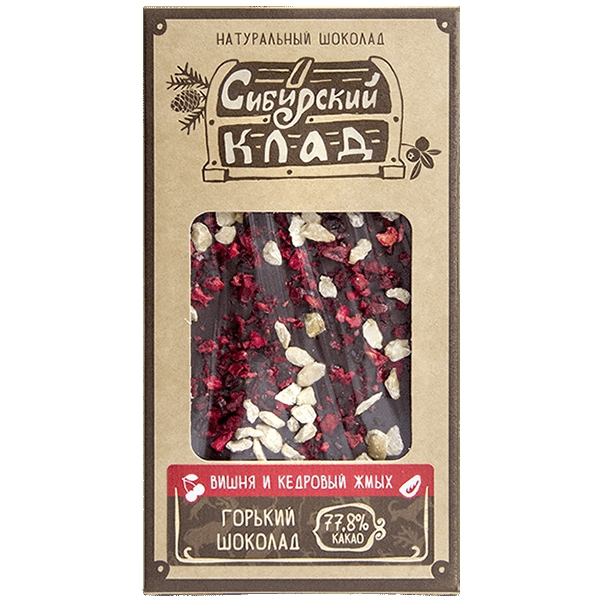 Горький шоколад "Сибирский Клад" приготовлен из какао-бобов "Фино де Арома", ароматной вишни, кедрового жмыха с лучших кедров Томской области и виноградного сахара.
