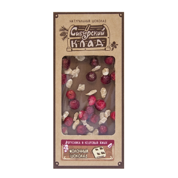 | Состав: | какао масло, какао тертое, сухое молоко, сахар тростниковый, жмых кедрового ореха, брусника сублимированная. |