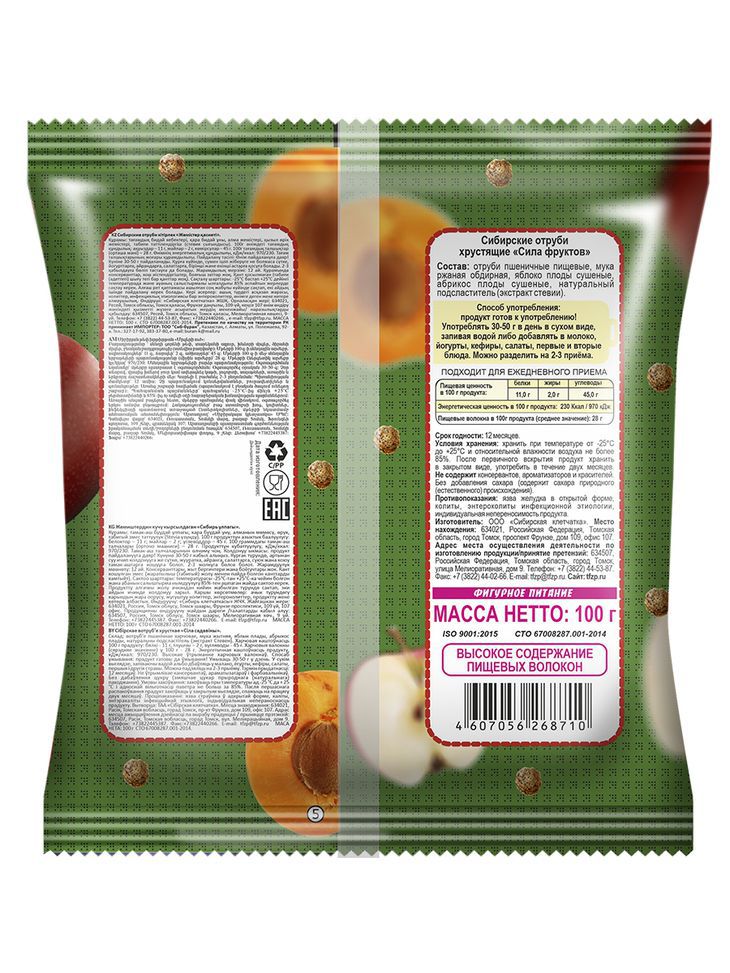 Сибирские отруби «Сила фруктов» не содержат сахара, консервантов, химических ароматизаторов и красителей. При беременности и лактации перед применением проконсультируйтесь с лечащим врачом.