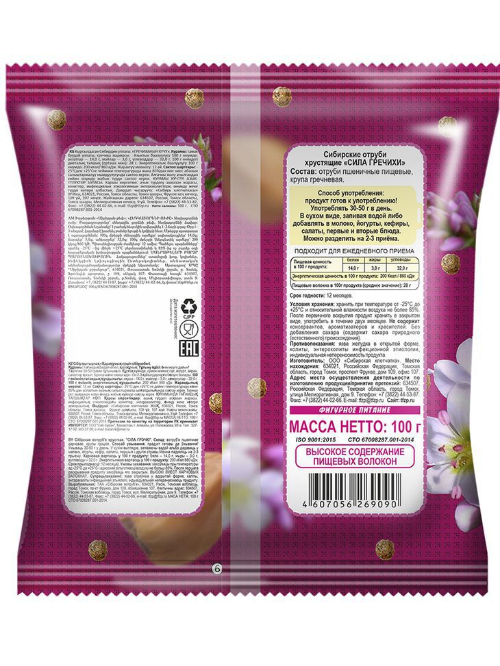Сибирские отруби «Сила гречихи» не содержат сахара, консервантов, химических ароматизаторов и красителей. При беременности и лактации перед применением проконсультируйтесь с лечащим врачом.