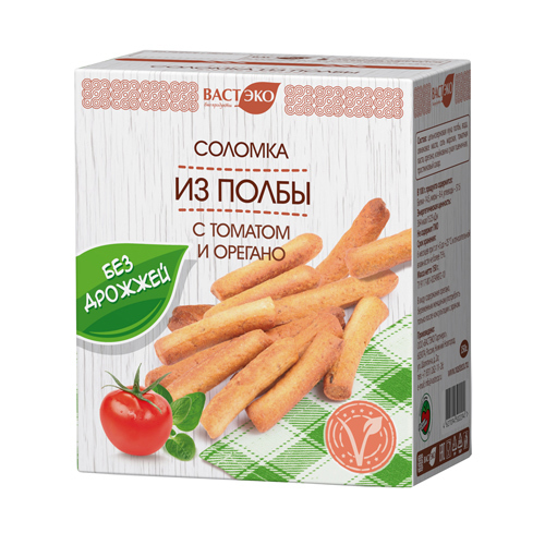 Соломка цельнозерновая из полбы с томатом и орегано без дрожжей. Постный продукт на оливковом масле! В составе только здоровые компоненты, не содержит консервантов, усилителей вкуса и красителей. Без маргарина.