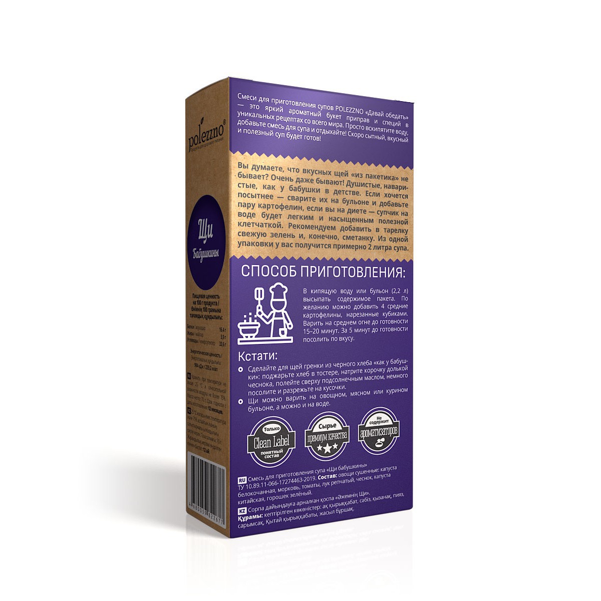 Вы думаете, что вкусных щей «из пакетика» не бывает? Очень даже бывают! Душистые, наваристые, как у бабушки в детстве. Если хочется посытнее – сварите их на бульоне и добавьте пару картофелин, если вы на диете – супчик на воде будет легким и насыщенным полезной клетчаткой. Рекомендуем добавить в тарелку свежую зелень и, конечно, сметанку. Из одной упаковки у вас получится примерно 2 литра супа.