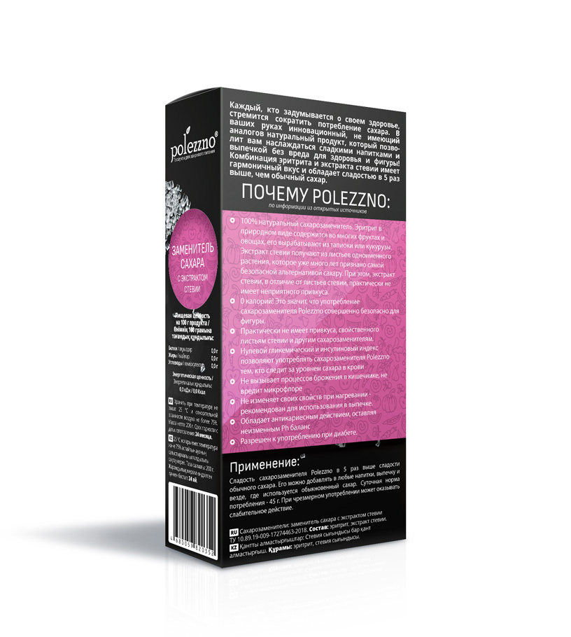 Сладость сахарозаменителя Polezzno в 5 раз выше сладости обычного сахара. Его можно добавлять в любые напитки, выпечку и везде, где используется обыкновенный сахар. Суточная норма потребления - 45г. При чрезмерном употреблении может оказывать слабительное действие.